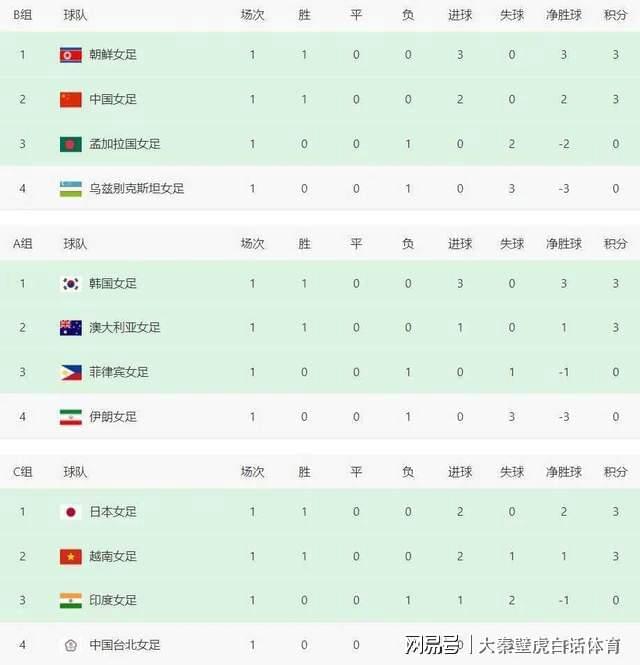 韩国女足、朝鲜女足和日本女足暂时位居三个小组头名,三队与中国女足、东道主澳大利亚女足共同构成本次亚洲杯夺冠第一集团。